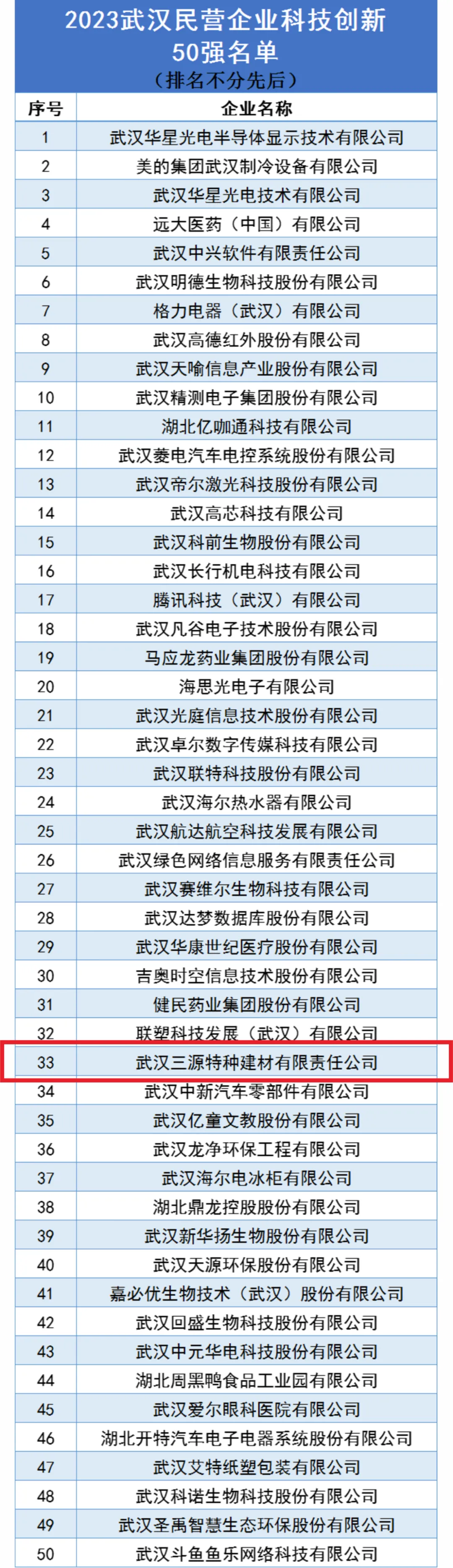 創(chuàng)新熱潮持續(xù)涌動,助力武漢高質(zhì)量發(fā)展??萍紕?chuàng)新50強營收總額1065.50億元,同比增長4.70%,高于民營企業(yè)100強和制造業(yè)50強營收總額增長率,高于全市地區(qū)生產(chǎn)總值(GDP)增長率。憑借研發(fā)投入、科技創(chuàng)新、人才培養(yǎng)等方面的突出成效,武漢三源特種建材有限責任公司企業(yè)科技創(chuàng)新實力獲得政府肯定,成功入選“2023武漢民營企業(yè)科技創(chuàng)新50強”首榜。