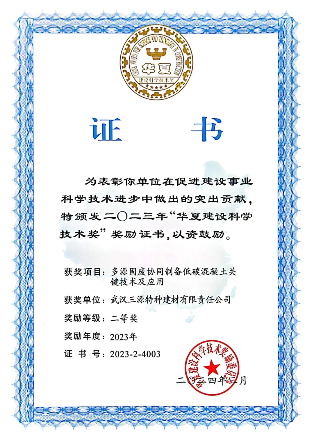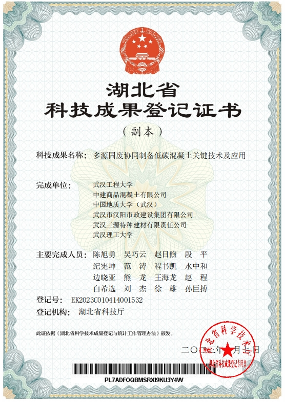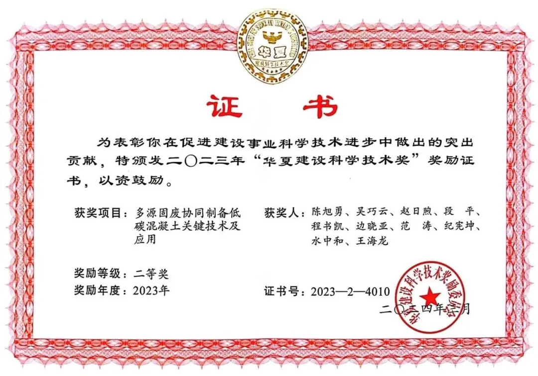 近日,住房和城鄉(xiāng)建設(shè)部華夏建設(shè)科學(xué)技術(shù)獎勵委員會發(fā)布“2023年度華夏建設(shè)科學(xué)技術(shù)獎”授獎公告,由武漢工程大學(xué)牽頭,武漢三源等多單位參與完成的《多源固廢協(xié)同制備低碳混凝土關(guān)鍵技術(shù)及應(yīng)用》項目成果喜獲華夏建設(shè)科學(xué)技術(shù)獎二等獎。